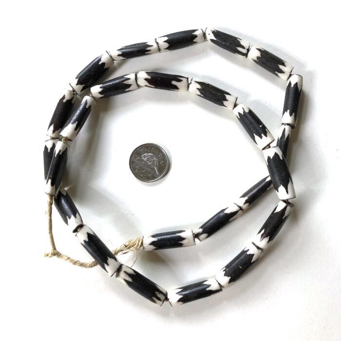 A strand of about 25 tubular Batik Bone Beads from Kenya strung on raffia 26″ long. These beads have a bold geometric design and shape that will give any necklace an eye catching tribal feel. Each bead is approx.25×8 mm. These beads are handmade so will have variations in colour, design and size.