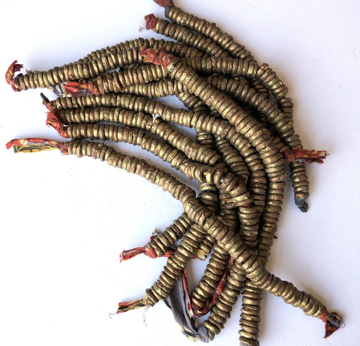 A strand of approx. 56 brass donut beads on strips of fabric 9″ long. These beads are handcrafted using recycled metal and have a brass colour. Each bead is approx. 12 mm.