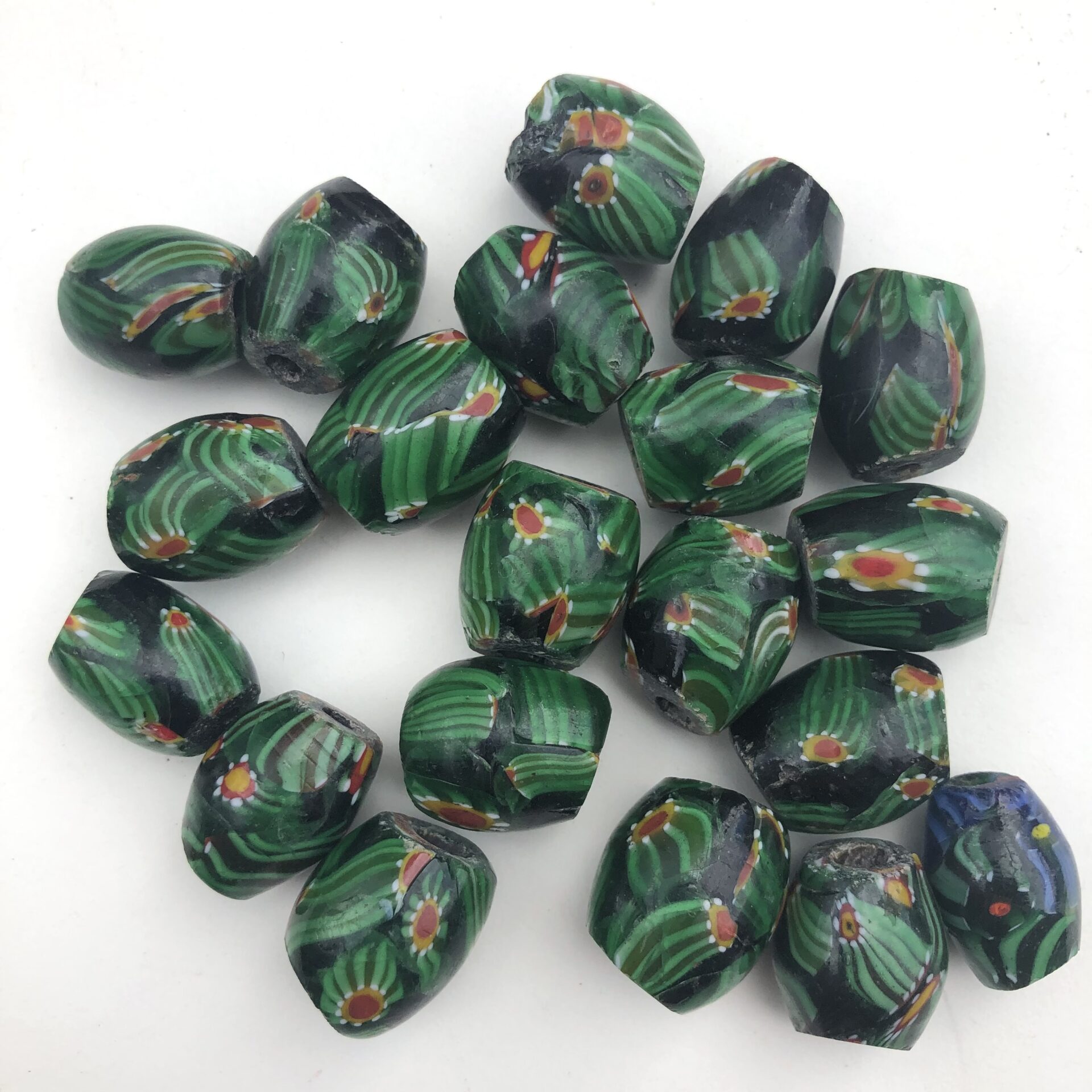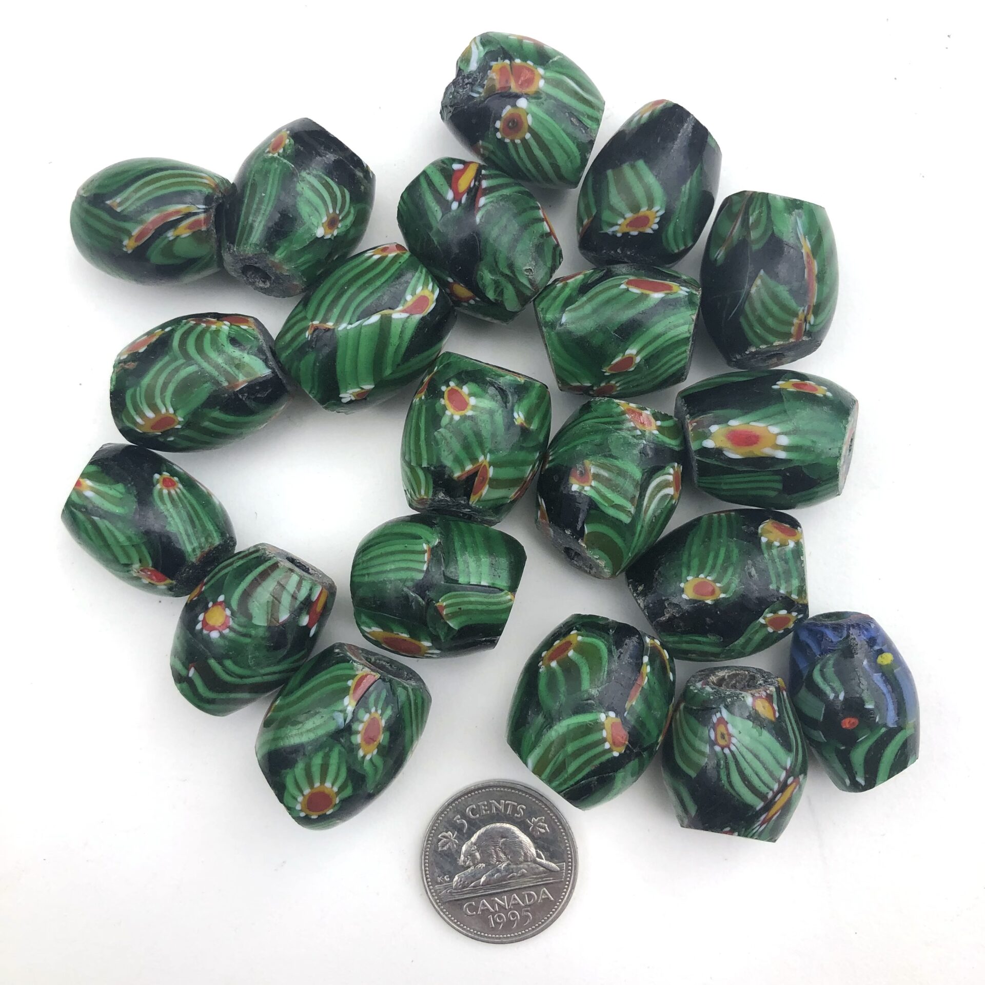 Green Indian Glass Bead … made in India, traded in Ghana, W. Africa and now available in Montreal, Canada!! Definitely a bead that has travelled!! About 19 mm with large hole.