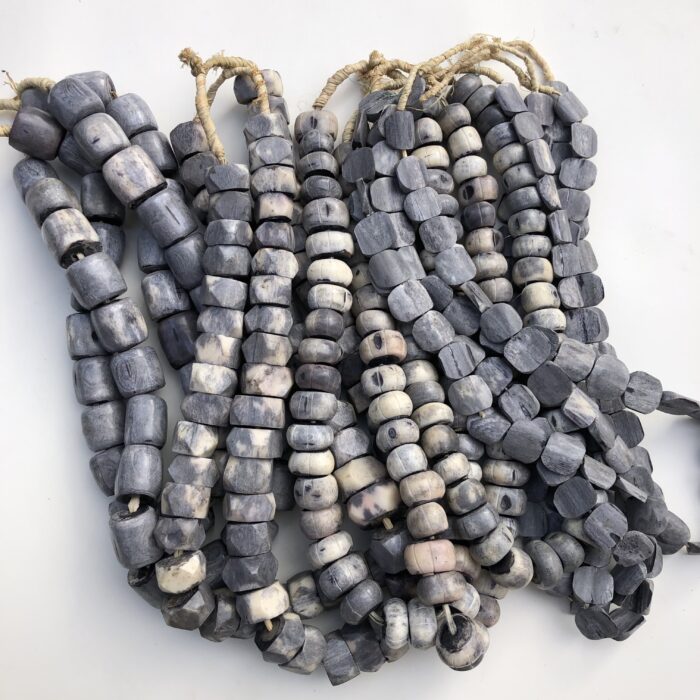 A strand of about 31 gorgeous smoke grey Disk bone beads from Kenya strung on raffia 26″ long. Each bead is a circular shape about 19 mm in diameter. These beads are handmade so will have a lot of variations in colour, shape and size.