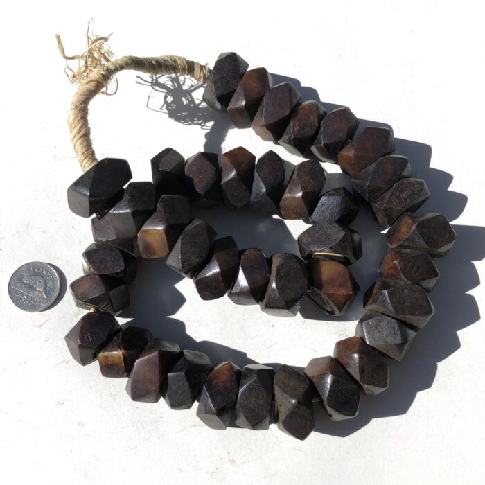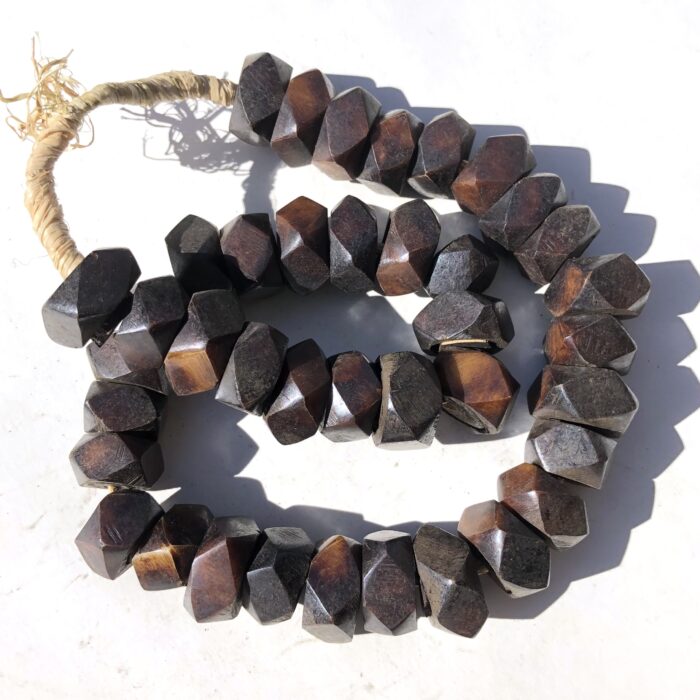 A strand of about 40 Brown Irregular Bone Beads from Kenya strung on raffia 24″ long. These beads are an irregular angular shape about 23 mm. These beads are handmade so will have variations in colour, design and size between strands.