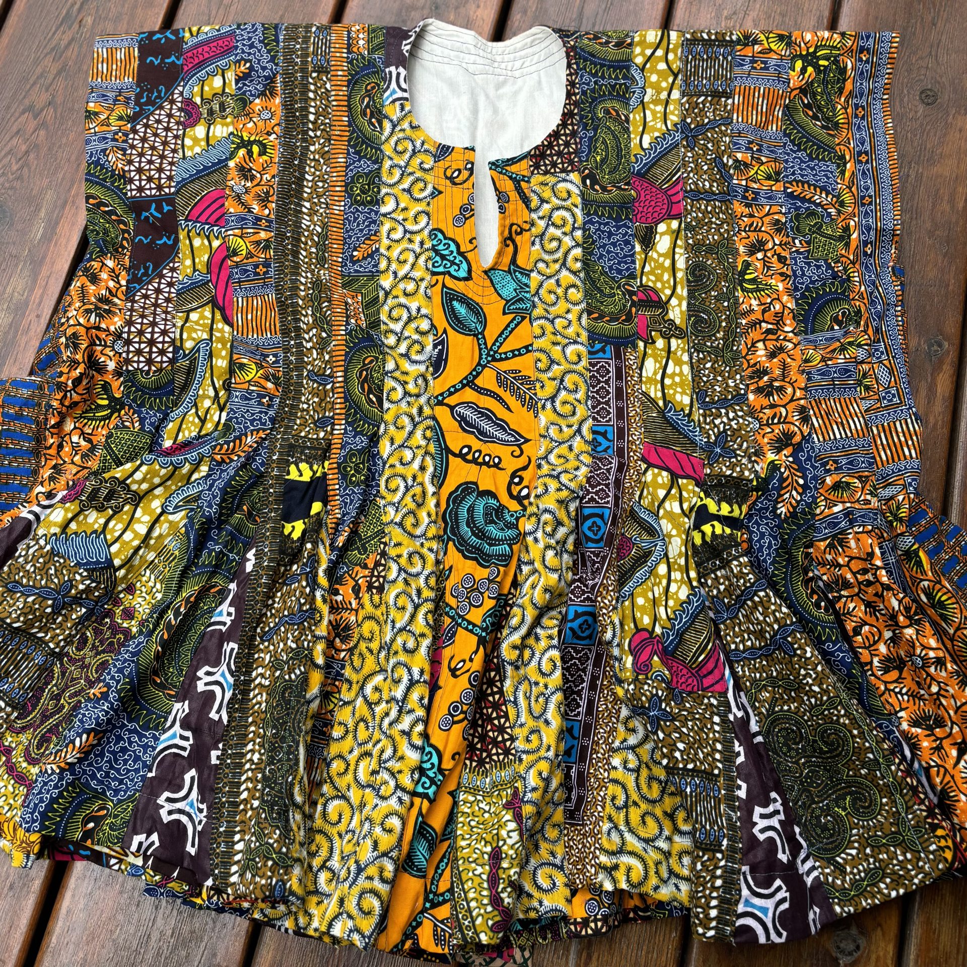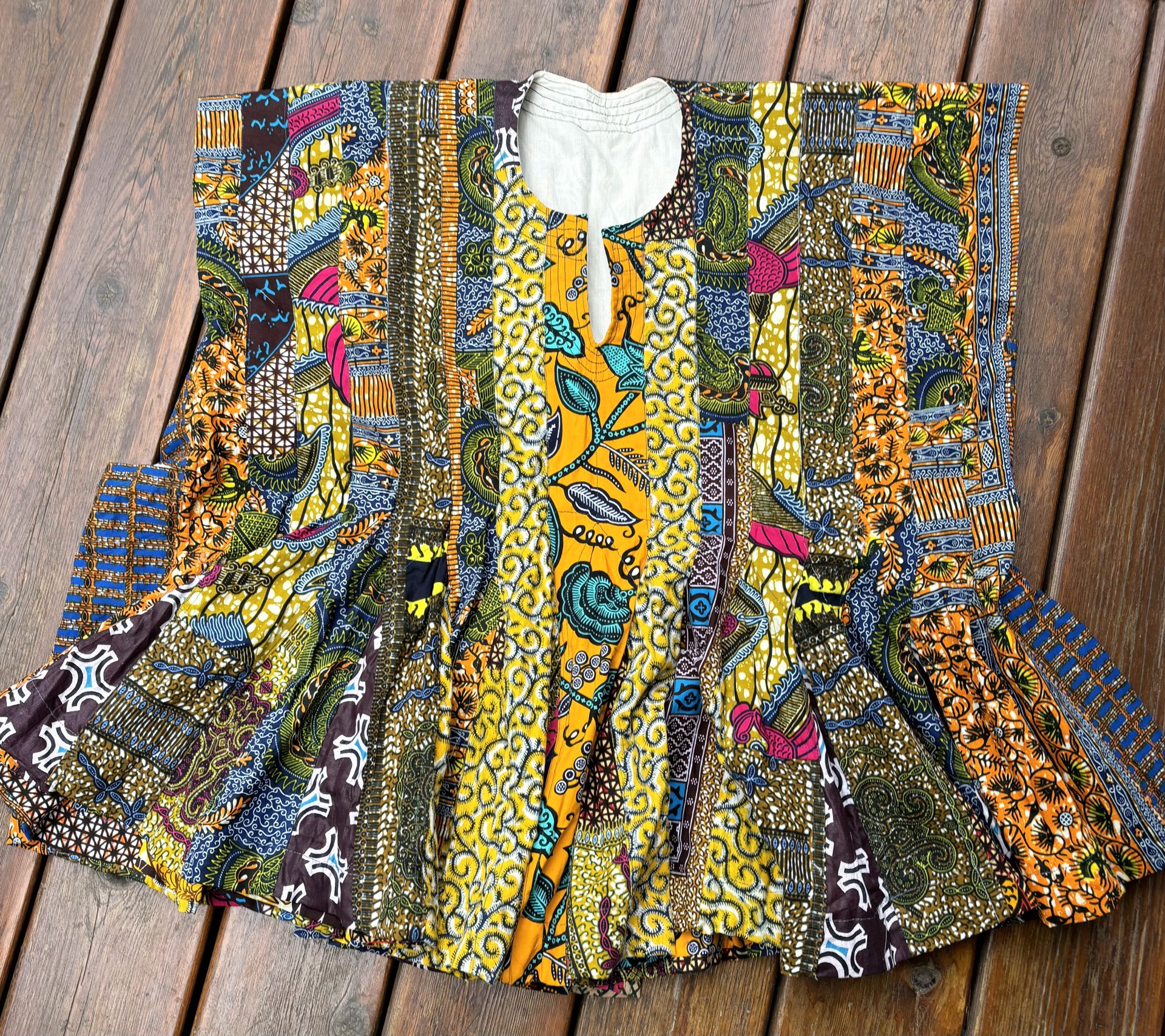 A gorgeous Traditional Smock …. with a modern twist! Hand made with hand stiching with beautiful Ghanaian batik fabric in patchwork pattern.